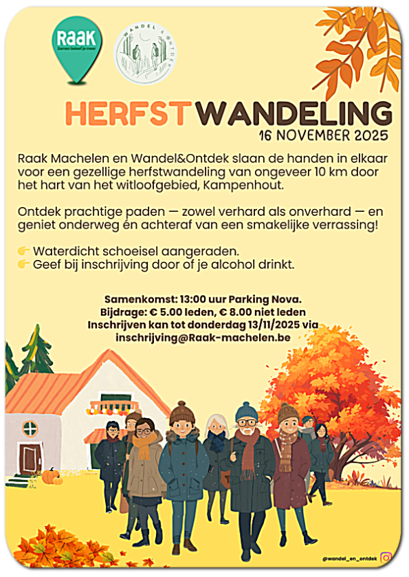 Op een herfstige dag een mooie wandeling maken? Dat kan op zondag 16 november om 13u mét Raak ism Wandel&Ontdek!